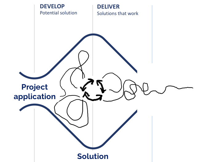 Research, needs analysis, planning, getting inspired, discussing the challenges and imagining possible solutions is all fine, but we don’t really understand and grasp the true nature of things until we start to design and develop real life solutions. The second diamond is where the action starts, when the project is kicked off, after being approved and funded. We pick up where the project brief and/or application left, by turning the plan into actual activities, based on estimated plans and budgets. This is by no means a simple implementation process. It is rather a continuation of the development work, but this time with the resources and time to make things happen. Ideas have to be brought into life. Solutions, products and services should be developed, tested, altered and finally delivered or implemented throughout the “Develop” and “Delivery” phases.